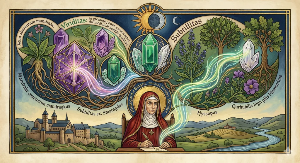 A través de su concepto fundamental, la Viriditas o «fuerza verde», Hildegarda describió la capacidad intrínseca de la naturaleza para regenerarse y sanar. Para la Sibila del Rin, las plantas no eran meros recursos estáticos, sino portadoras de una vitalidad dinámica que denominó subtilitas, una cualidad medicinal que reside en el interior de cada tallo y raíz [2]. En su tratado Physica, catalogó con precisión asombrosa más de doscientas especies vegetales, otorgando a la botánica una dimensión terapéutica que devolvía al ser humano la responsabilidad sobre su propio cuerpo mediante el conocimiento de la tierra. Esta visión de la salud integral conecta directamente con la ética de Pitágoras [3], cuya defensa de la dieta vegetal y el orden armónico del cosmos resuena en cada página hildegardiana.