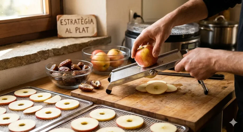 Para una deshidratación superior, el grosor es la clave. Un corte constante (entre 2 y 3 mm) garantiza que cada lámina de manzana pierda el agua de forma uniforme, transformándose en un snack crujiente que mantiene toda su potencia enzimática. Sumerge las láminas en agua con una pizca de sal marina o limón para evitar la oxidación y realzar el dulce natural de la fructosa.